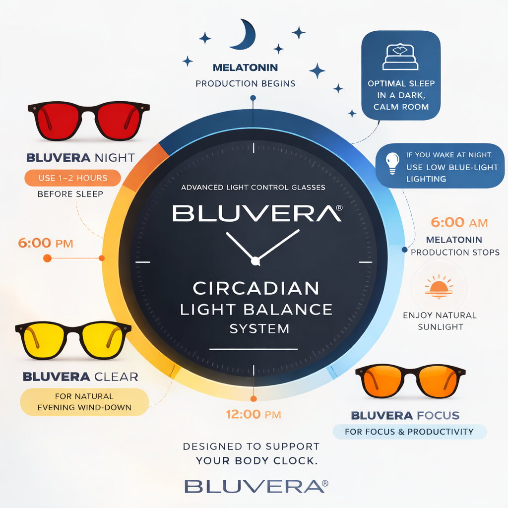 The light you’re exposed to throughout the day affects your focus, energy, and sleep. Bluvera® glasses help manage blue light exposure, supporting your circadian rhythm for better focus during the day and deeper sleep at night.